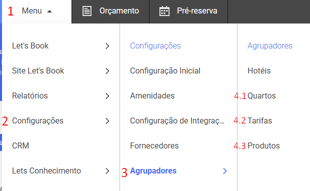 Para acessar essa funcionalidade estratégica, navegue até o menu "Configurações > Agrupadores". Lá, você encontrará os submenus dedicados aos Agrupadores, que possibilitam criar grupos de tarifas, quartos e extras para maior facilidade na leitura e análise dos dashboards do relatório de performance de vendas.