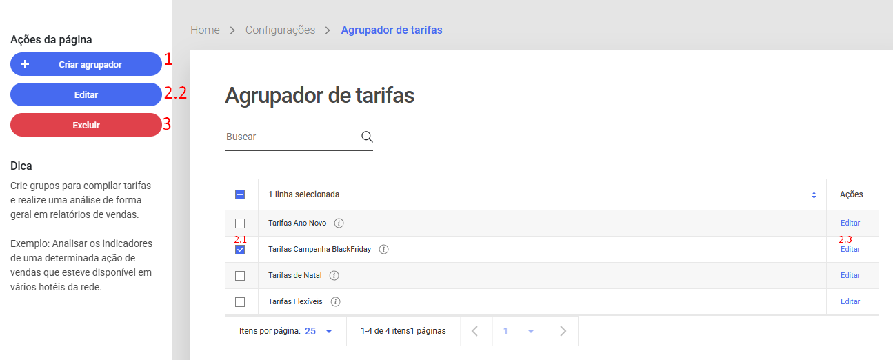Você poderá criar um novo agrupador (1) ou então selecionar um já existente (2.1) no checkbox e editar (2.2), além de poder clicar em editar na linha correspondente (2.3).