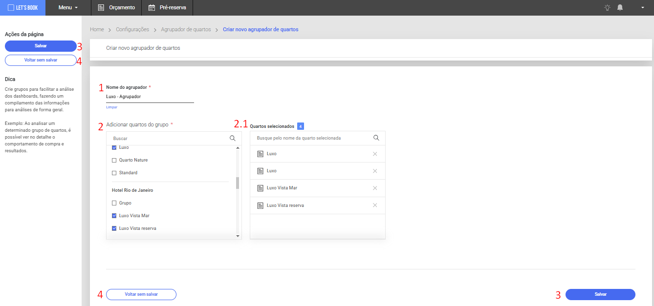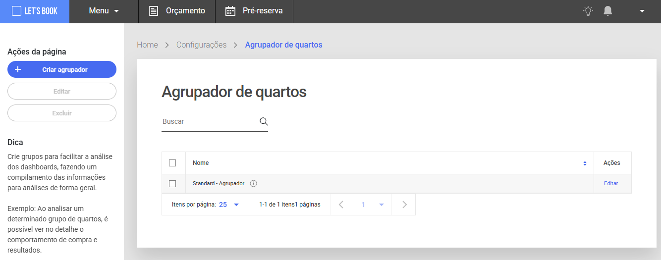 O processo de criação, edição e exclusão de agrupadores de quartos segue a mesma lógica do Agrupador de Tarifas.