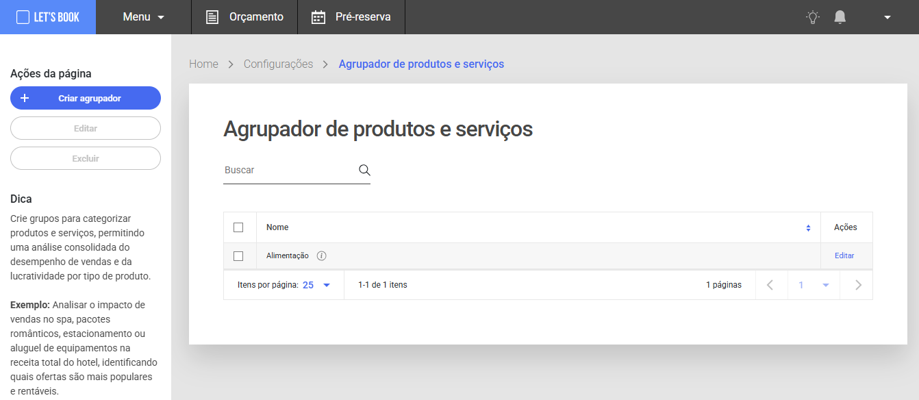 O processo de criação, edição e exclusão de agrupadores de extras segue a mesma lógica dos Agrupadores de Tarifas e Quartos.