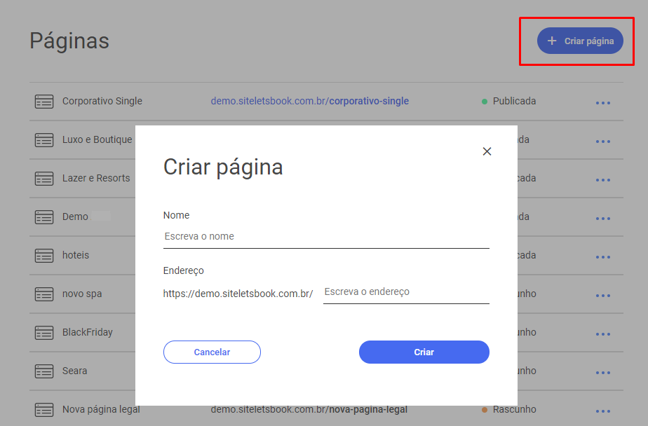 Visualize as landings criadas anteriormente e o status de cada uma. Aqui é possível editar as landings criadas, alterar o status de publicação ou criar uma nova landing.