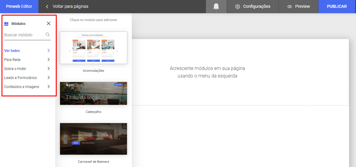 Adicione módulos através do menu esquerdo. Há diversos muitos módulos diferentes para que você possa montar landings únicas, de forma simples e prática!