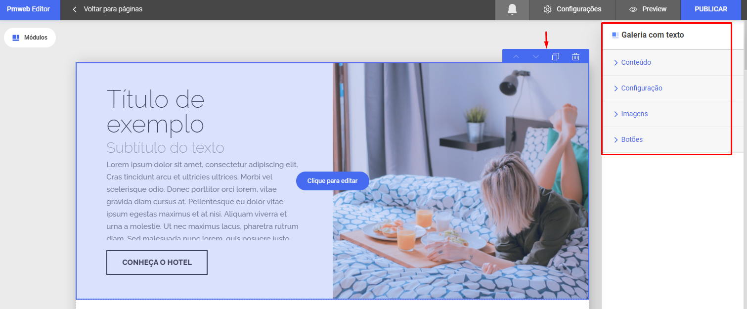 Ao selecionar um módulo, ele irá aparecer no corpo de sua nova landing page. Ao clicar no módulo, abre um espaço para edição na lateral direita, onde é possível alterar textos, fotos, cores, etc. Na aba azul, mude a posição do módulo, duplique o módulo existente ou exclua-o da landing.