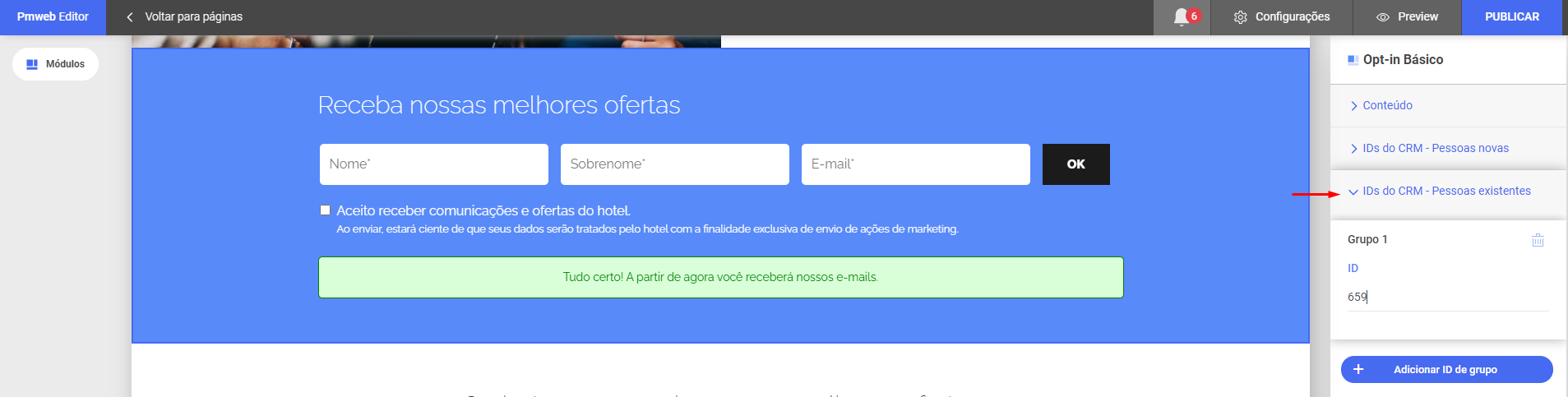 Caso seja escolhido um bloco de opt in, ao clicar em cima dele é possível determinar em qual/quais grupo(s) do CRM esses contatos ficarão. É necessário que o grupo já esteja criado dentro do CRM e é possível selecionar um grupo específico para novas pessoas e outro para pessoas que já estão na base.