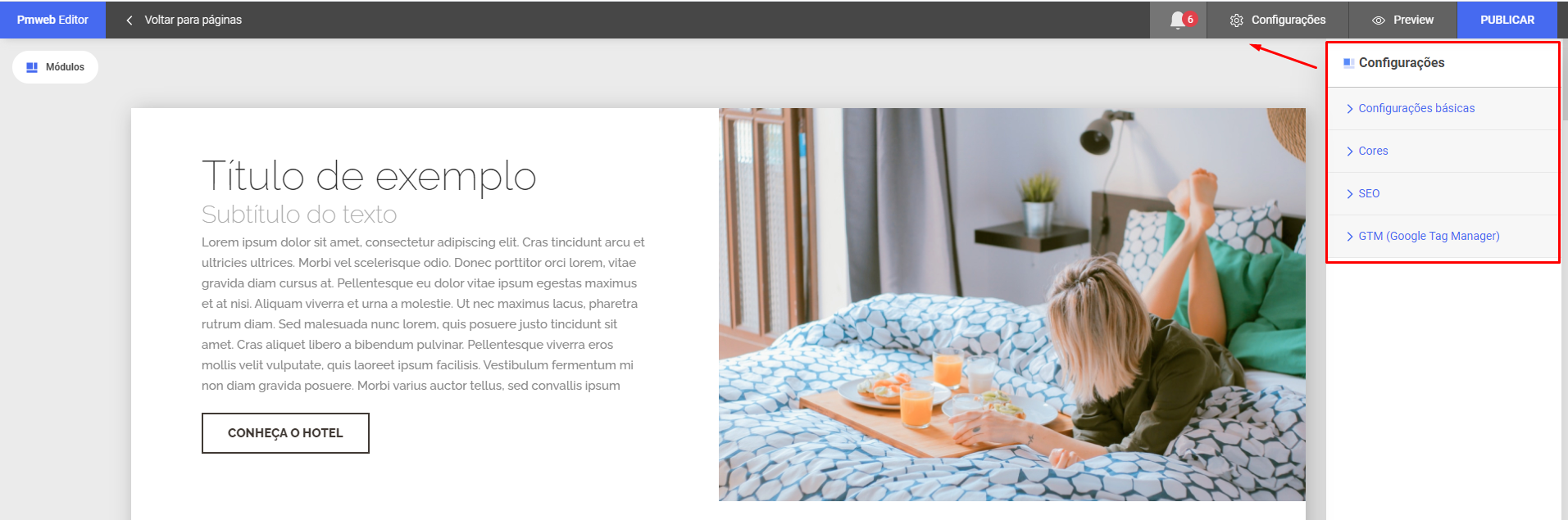 Além das configurações dos módulos, existem também as configurações gerais da página, que podem ser acessadas através da engrenagem no canto superior direito. Ali é possível alterar cores, logo, favicon, e também inserir a UA do GTM para criar parametrizações personalizadas para a landing!