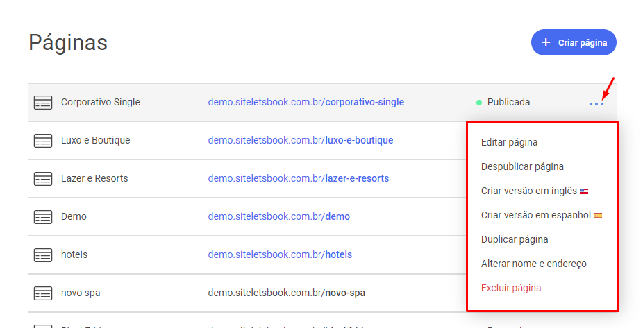 Para editar uma landing criada previamente, clique nos pontinhos conforme indicado abaixo:
