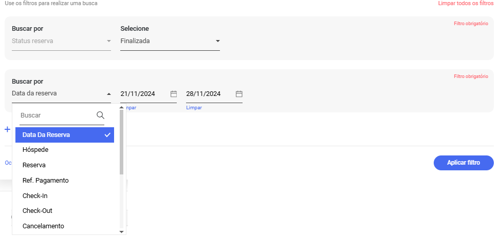 Utilize os filtros para refinar sua busca. Os filtros padrão (obrigatórios) são "Status da Reserva" (predefinido como "Finalizadas") e "Data da Reserva" (predefinido como últimos 7 dias). Você pode modificar os valores desses filtros, mas não excluí-los. O filtro de data da reserva pode ser alterado por alguns outros, mas, é obrigatório que seja um destes: