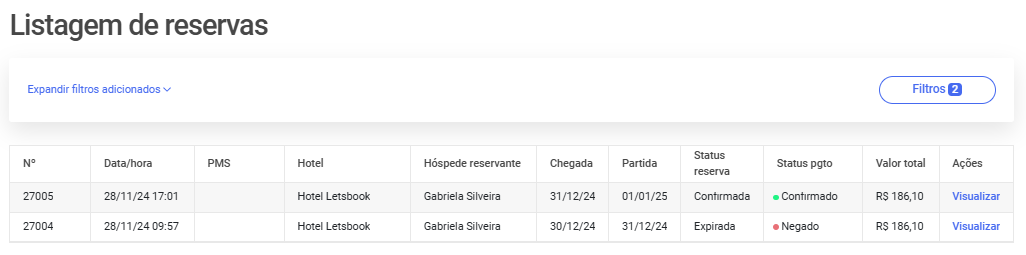A lista de reservas exibe as seguintes informações, de acordo com o filtro anterior aplicado: