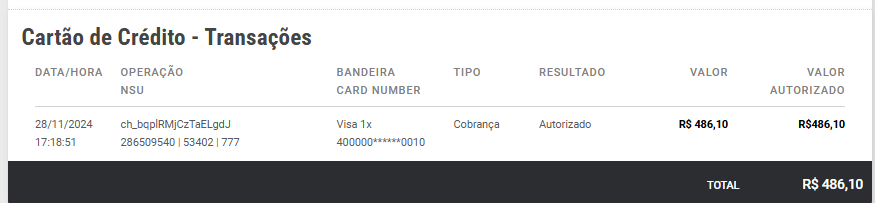 A seção de pagamentos exibe os detalhes da transação, incluindo: