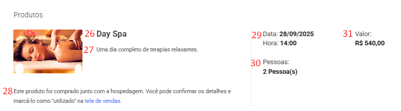 28. Informação se o produto foi reserva em conjunto com a hospedagem ou posterior. Link para a tela de vendas para maiores informações